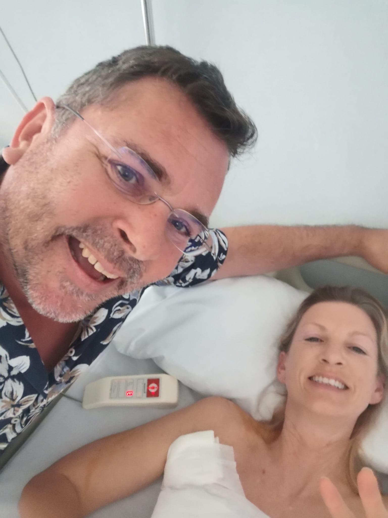 If you know Mallorca, I can recommend the hospital PalmaPlanas. All of the appointments needed – CAT scan, mammogram, biopsy, etc have been done there. They were always very professional and kind. So I parked in the parking lot and checked myself into the hospital. My room was a private room with a sofa bed if Felix wanted to spend the night. A sweet younger team of three came to take my blood pressure, ask a few questions and gave me that sexy hospital gown. About an hour later a guy showed up with a hospital bed and wheeled my down to prep for surgery.