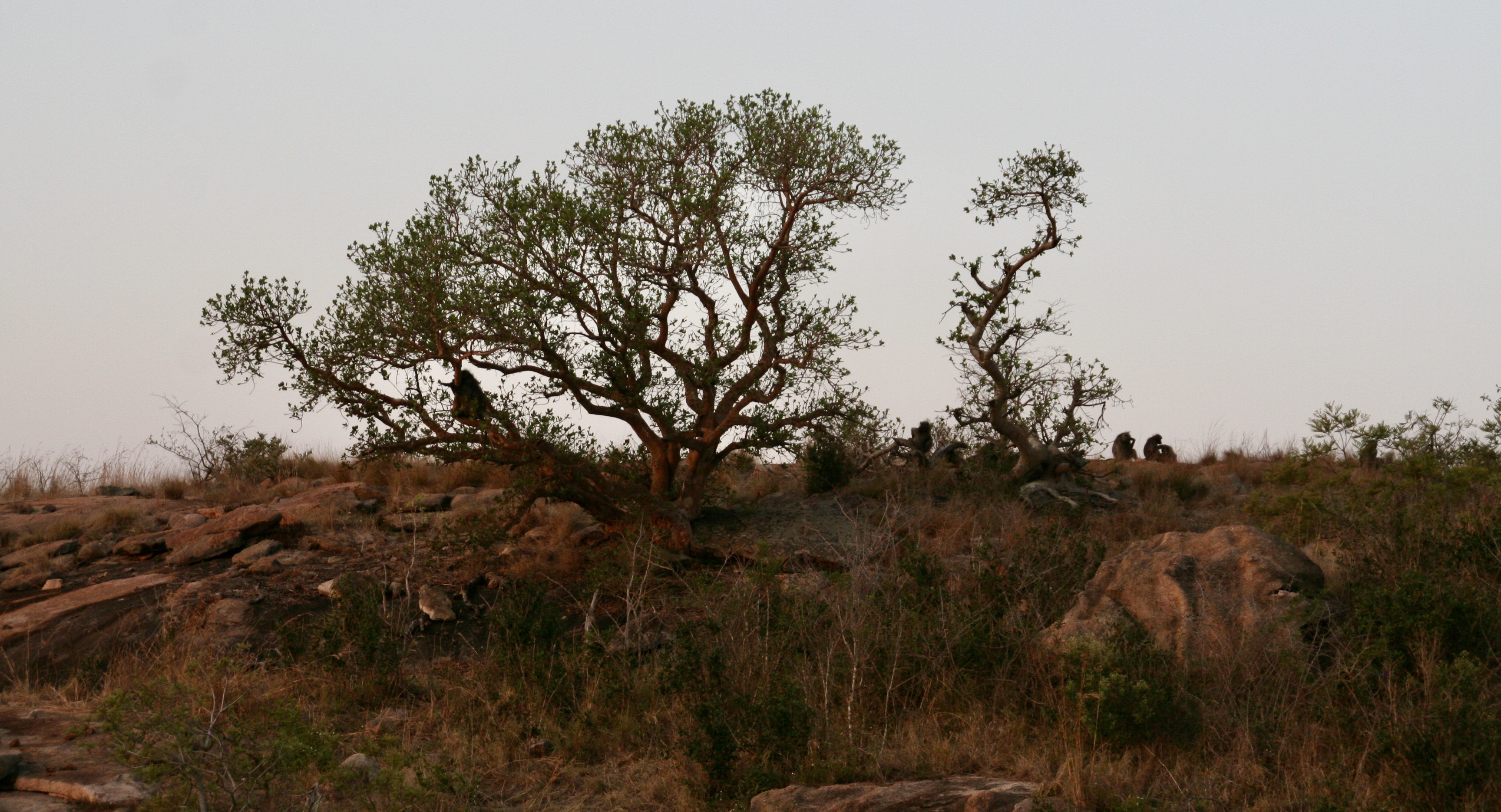 So now we’ve seen three of the Big Five – c’mon lions and rhinos! We went back for lunch and headed out after that for some more sightings where we saw zebras, giraffes, warthogs, steenboks (they are so cute), hyenas and near the end we stopped to take a picture of the sunset and there was a HUGE baboon in a tree with lots of baboon family around. After about ten minutes they started heading down the hill towards us – we were outside of the jeep taking pics of the sunset!!! We quickly made our way back to the Jeeps and watched them move from the hill to the other side where it was higher and rockier. Really cool to see the whole family progression. Do you see the big guy in the tree? And some of the family too his right and the ground.