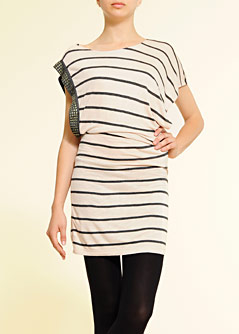 A light pink and grey striped dress with a loose-fit top and tight skirt. From Mango at a steal for 40 Euro. Go get one before they are all gone!