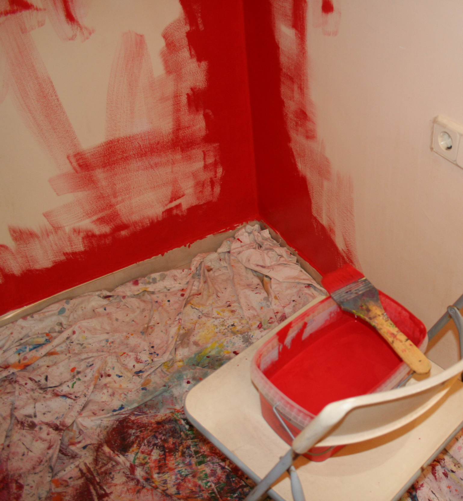 Some sites say to prep the walls, meaning paint them white first. I can see where that would be important if you were painting a light color but with red, I forgo that step.