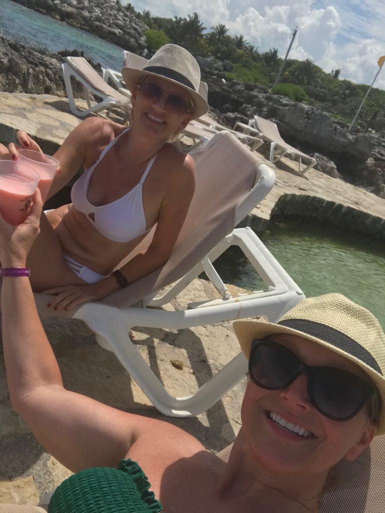 Soon I met the fabulous Bess in the lobby and we grabbed a margarita before finding the others. The resort is all-inclusive so grabbing a drink or two or three is easy and you don’t need to worry about keeping track of how much you’ve spent! Or even how much you drink! 😉 We met most of the gang at the seafood restaurant – there are eleven restaurants to choose from and I enjoyed the Paco’s Tacos the best (pizza AND tacos), because you really can’t go wrong with either of those. But there is also a huge buffet restaurant with so many options of salads, fruit, breads, pasta, main courses, desserts …. more more more. And there you can wear what you want because some restaurants have a dress code. And breakfast every morning for me was the buffet by the lagoon. My morning view was this. Gorgeous, right?!