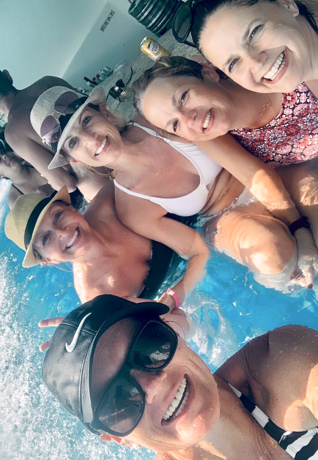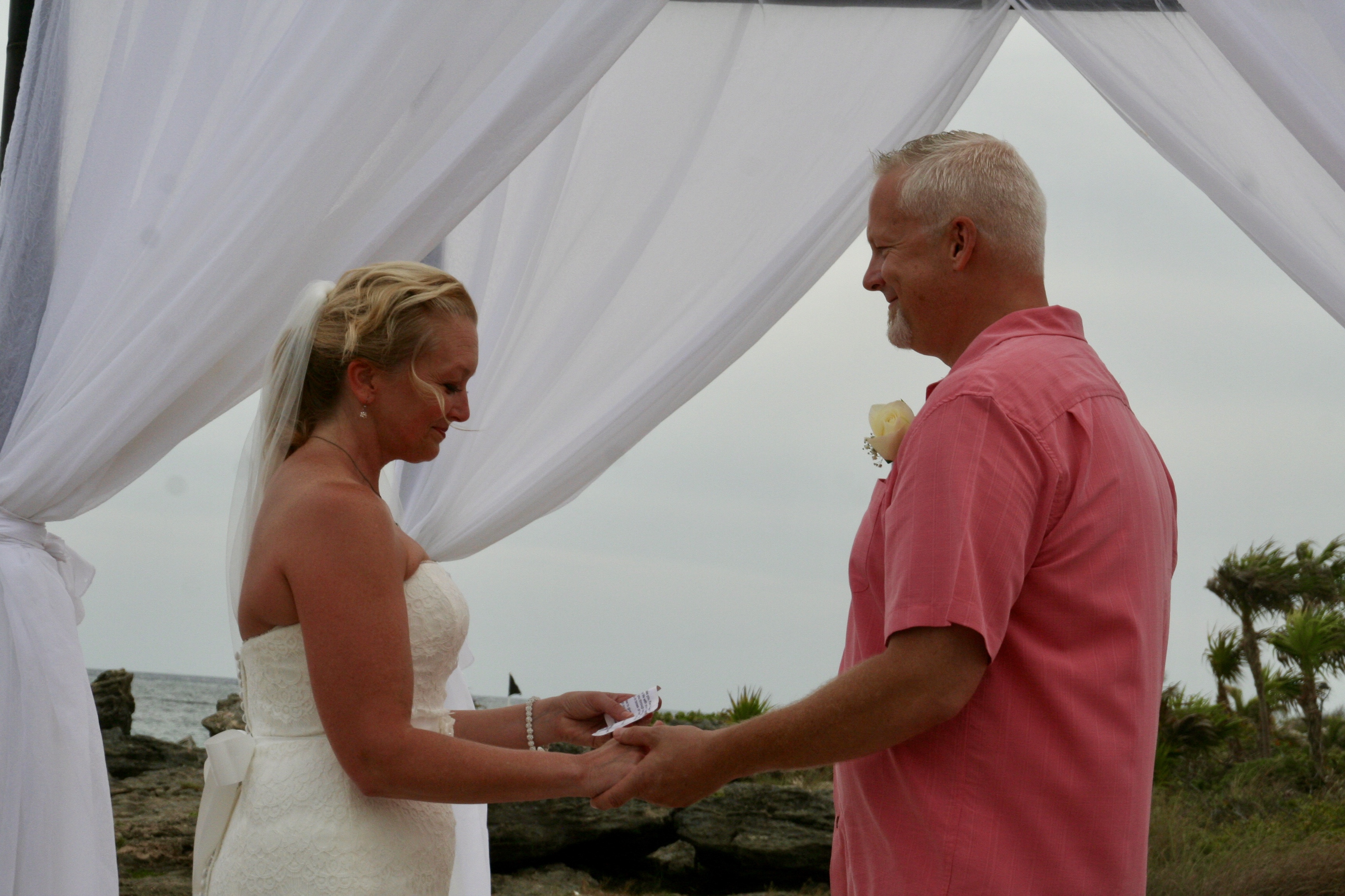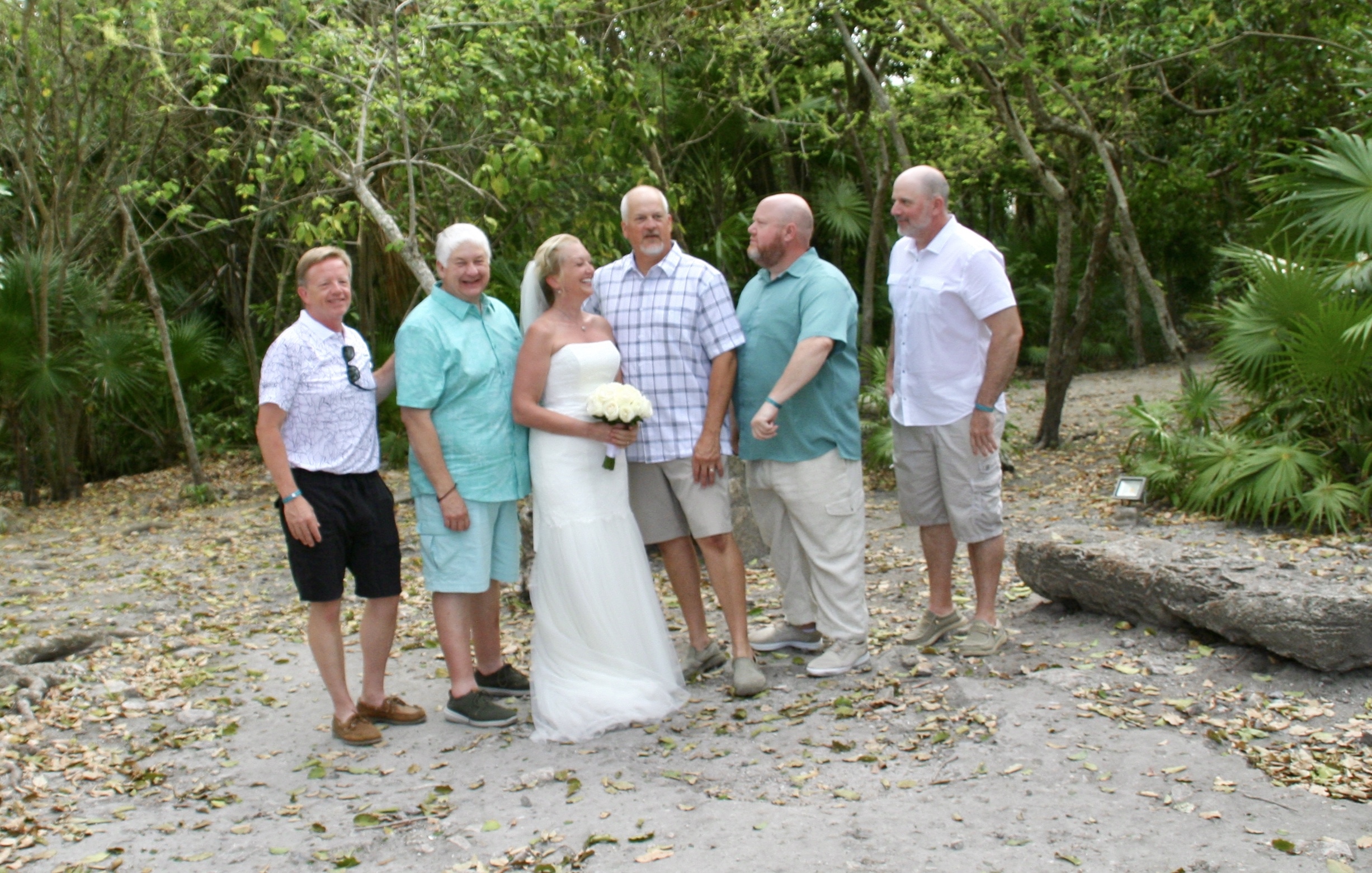 Then it was wedding day!!! Yippee!!! It was pretty chill to start with and we hung out around the lagoon. Some of us got up early to save the big beach lounge beds and some lounge chairs down by the water. We soaked up the sun and worked on the song list and had a Rum Runner or two and then it was time for the nuptials. It was perfect, between the ocean and one of the bigger ruins on the grounds. The ceremony was simple and beautiful – that must make it simply beautiful. Then off for an hour reception to have a snack, a cocktail, take some photos, sign the wedding book and watch the bride seriously think about shoving a handful of cake in her husband’s mouth. A very lovely evening with many people I have known for most of my life and getting to see and meet their children. A time never to be forgotten with many lovely and funny memories made. Let the tears commence!