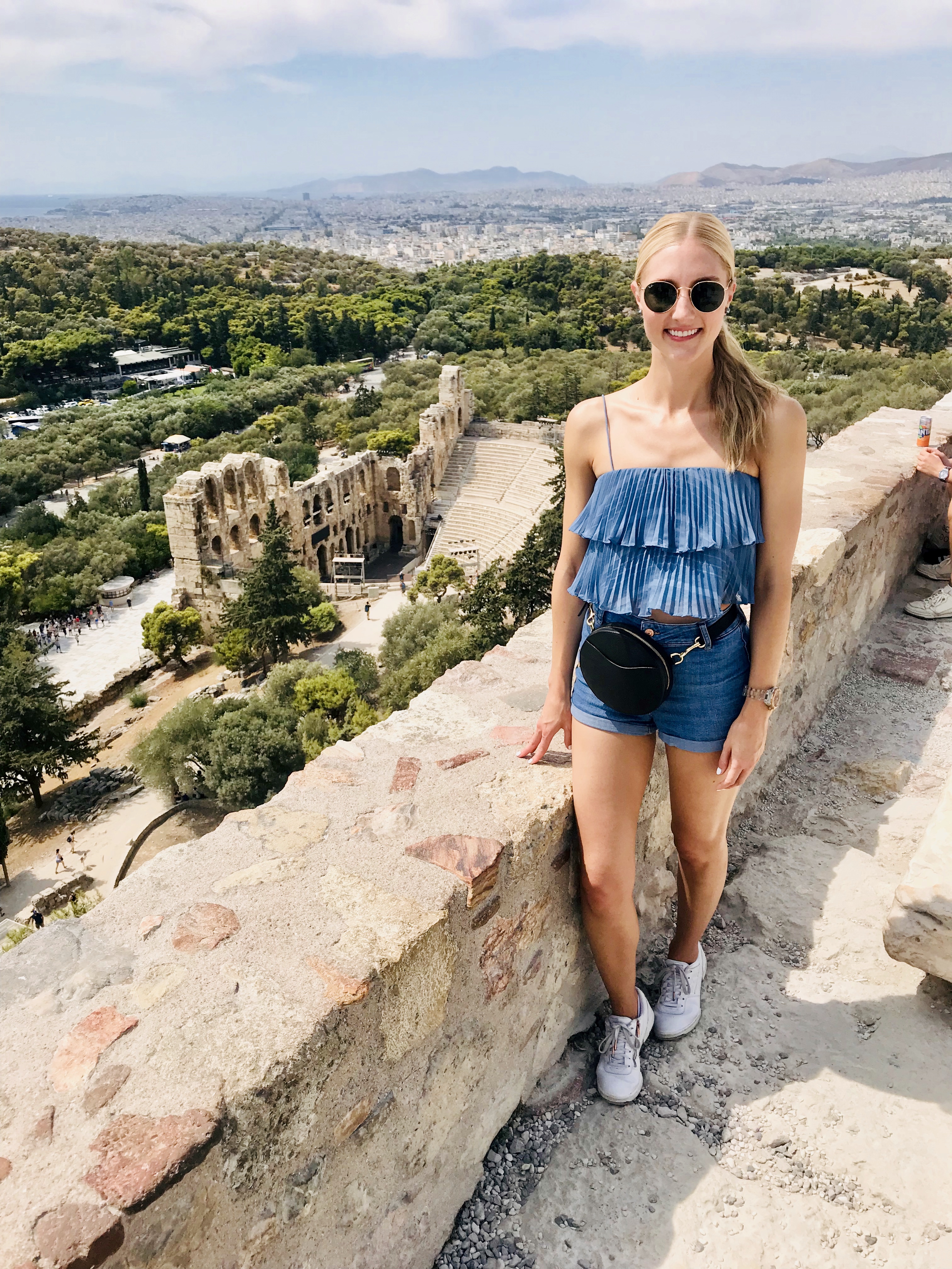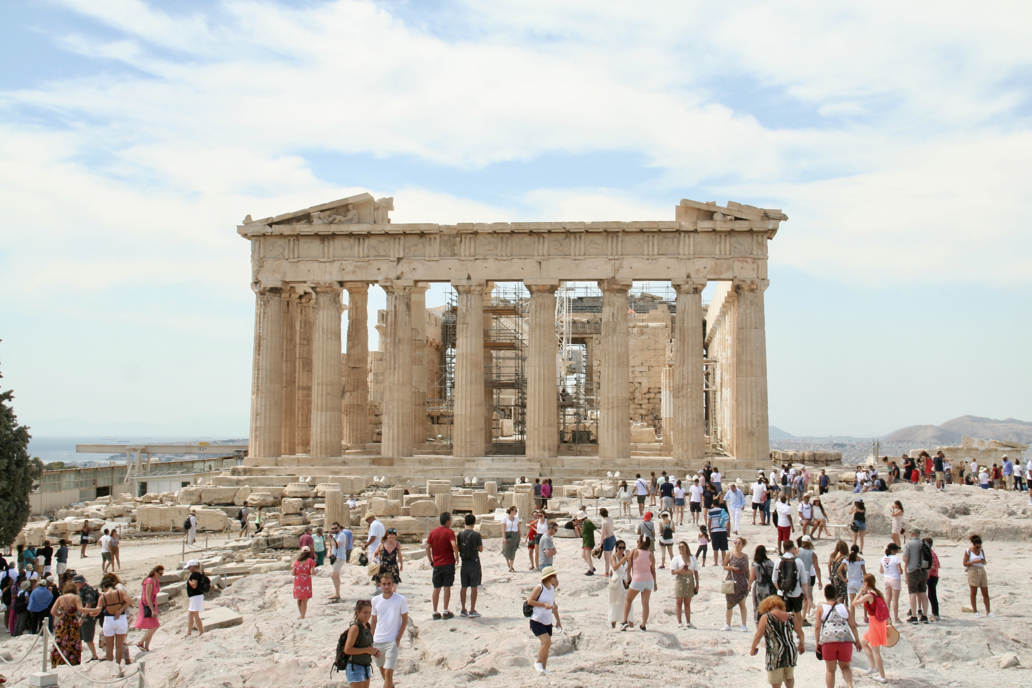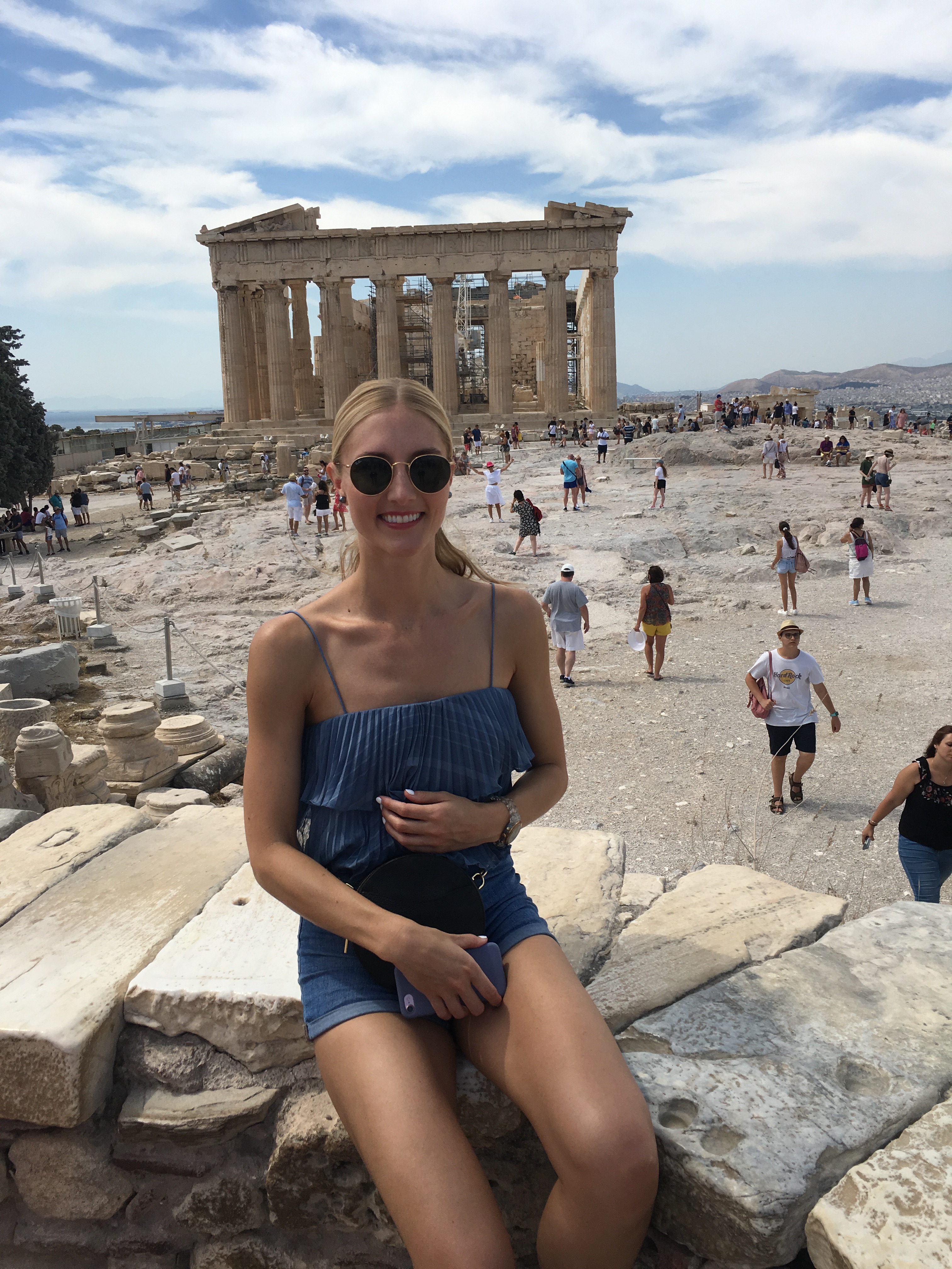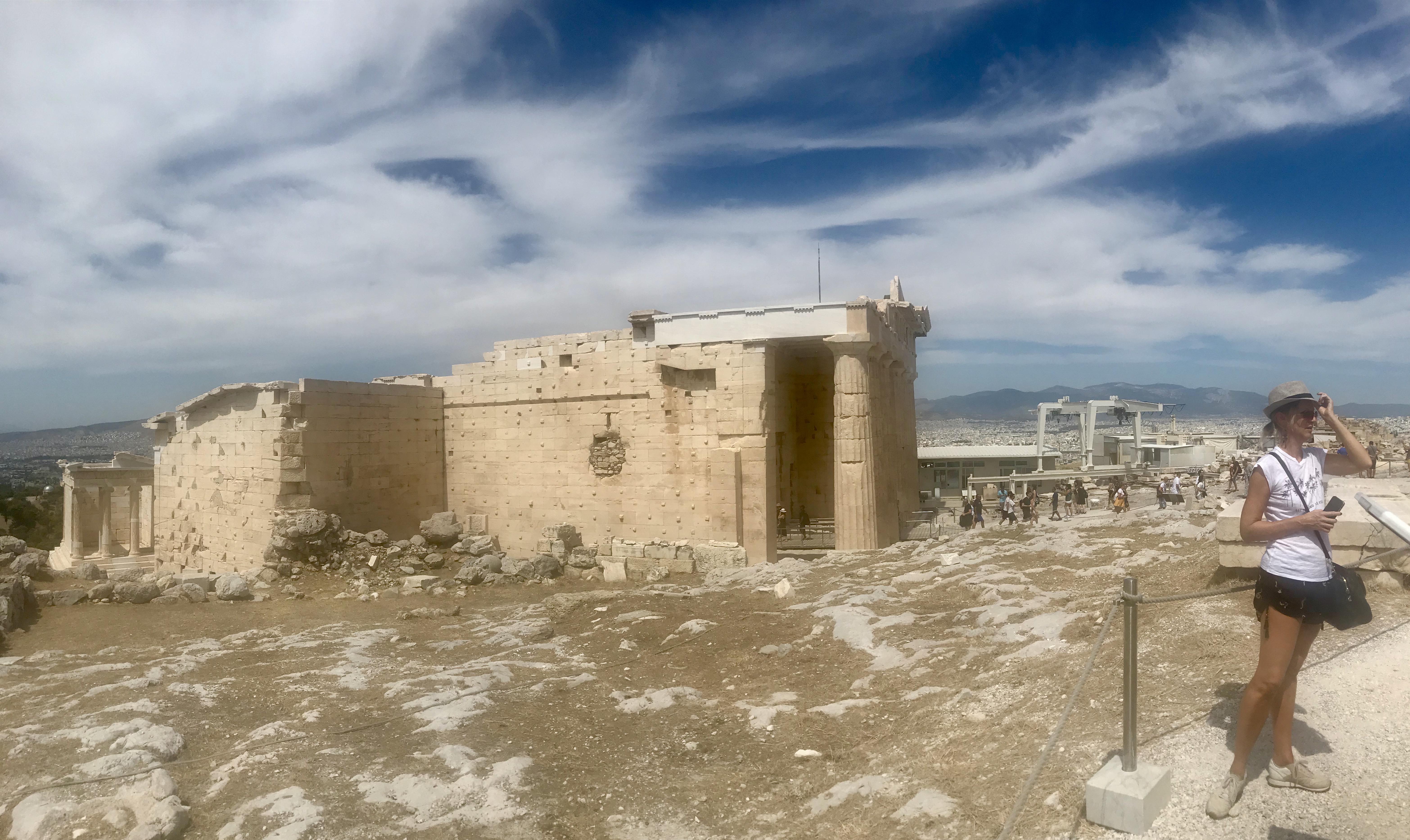 First things first. Breakfast! Yes, tzatziki was involved. 🙂 Along with fresh fruit, a pastry with spinach, a very hot tea and lots of water. Only then were we ready to venture out to the glorious Acropolis in the sky. And I do mean in the sky! It’s high up on a hill. AND we walked! Very proud of ourselves. It wasn’t too difficult but the day was super hot and I only brought a small bottle of water. From the hotel it was about a 30 minute walk to the entrance. You need to buy tickets (I think they were 20 euro each) and there is a place before you enter to buy drinks – lemonade slushes, coffee, beer but NO water! And I can’t even tell you how many times I heard people ask for water and every single one was incredulous that water wasn’t sold. Even one lady said to the man, “You don’t have water!?”. “No, no water,” he answered. “No water?!”, she asked again. He replied, “Maybe if you ask me twenty times more there will miraculously be water.” Needless to say she left without ordering anything. I smirked and ordered a lemonade and strawberry slushy. But then the joke was on me – nobody can enter the Acropolis grounds with any food or drinks. Ha! But water is allowed …….