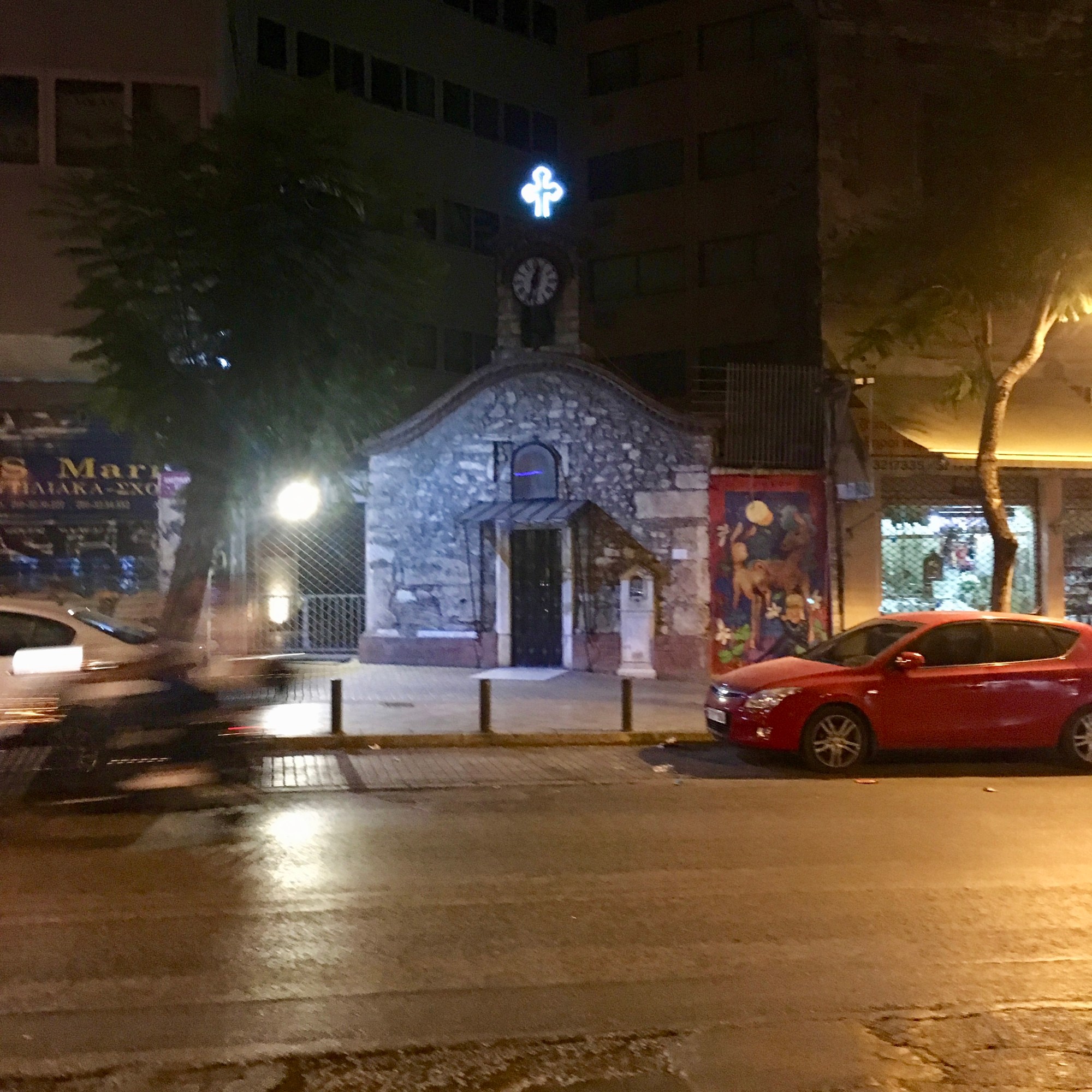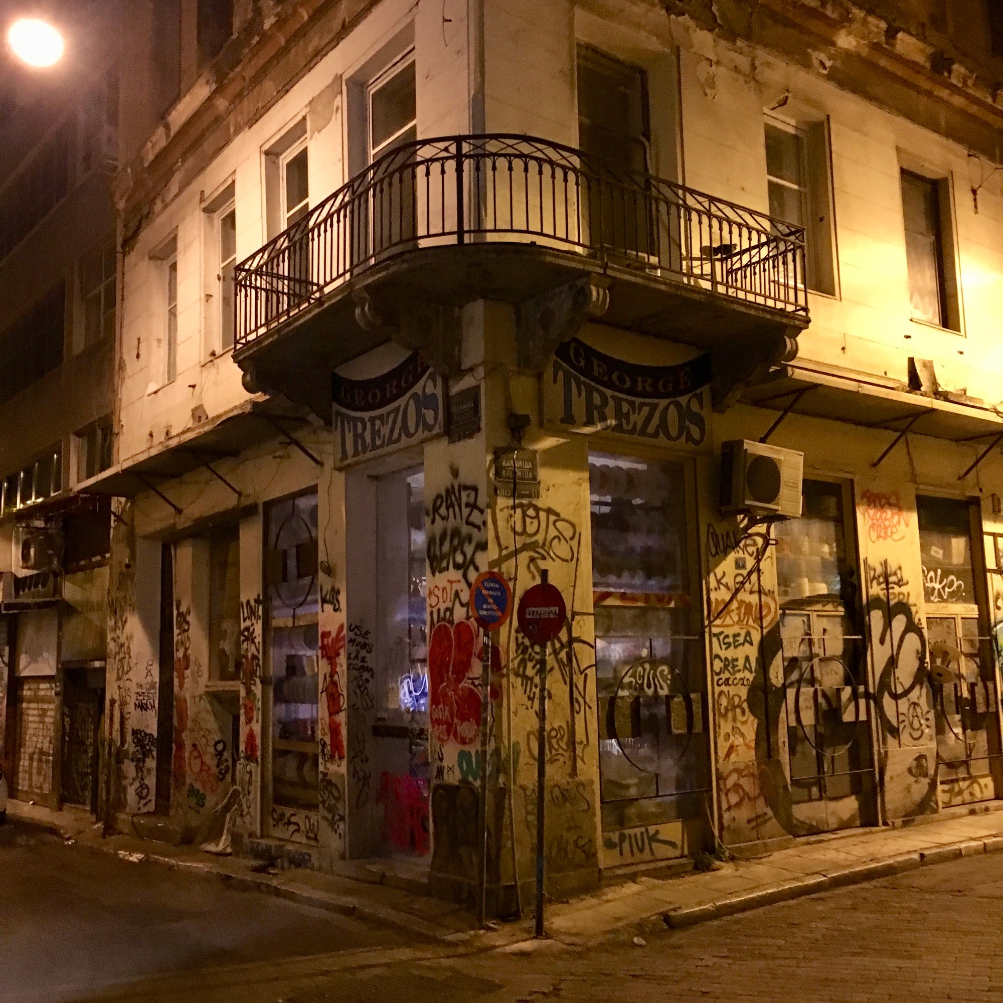 We arrived late in the evening, there was only one flight out of Barcelona to Athens leaving at 6:30 p.m. so we arrived at the airport around 10:30 (3 hour direct flight plus one time difference). The hotel, Grecotel Pallas Athena, had reserved a driver for us at the airport and he whisked us to our boutique hotel, smack dab in the middle of Athens. The location is superb, the eclectic design is super fashionable and I never turn down a free breakfast, which was delicious as well. But as I said, we arrived late, thankfully there were still plenty of options for dinner for us to choose from. We wandered through the streets to the restaurant the front desk dude told us about and enjoyed our first views of Athens. Here are a few sights from that first night: