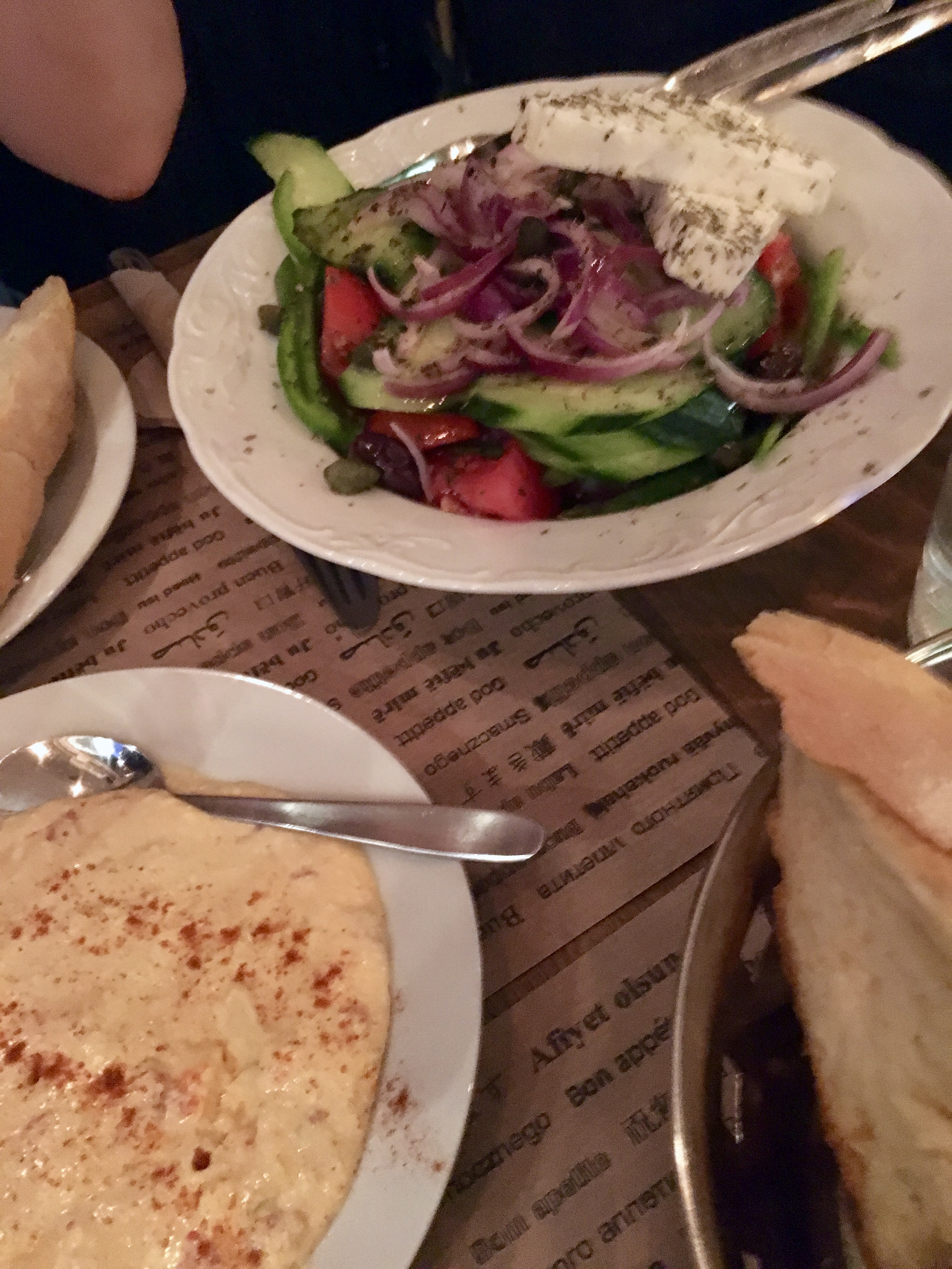 After the Acropolis and Agros we were a bit pooped. We walked back to the hotel to shower and relax before dinner. I did a little research for dinner – I like to eat at nice restaurants and stay in nice hotels so I always do a bit of delving into the internet for the best places. And this time it also still had to be within walking distance. On our way to the restaurant we turned down this street and there was one cute restaurant or bar after another. And then there was the place I had chosen – Bandiera at Taki 19, Athens. They don’t have a website but the food and house wine was one of the best places we ate in Greece. We had the hot pepper and cheese dip, tzatziki 🙂 and a greek salad. YUM YUM YUM.