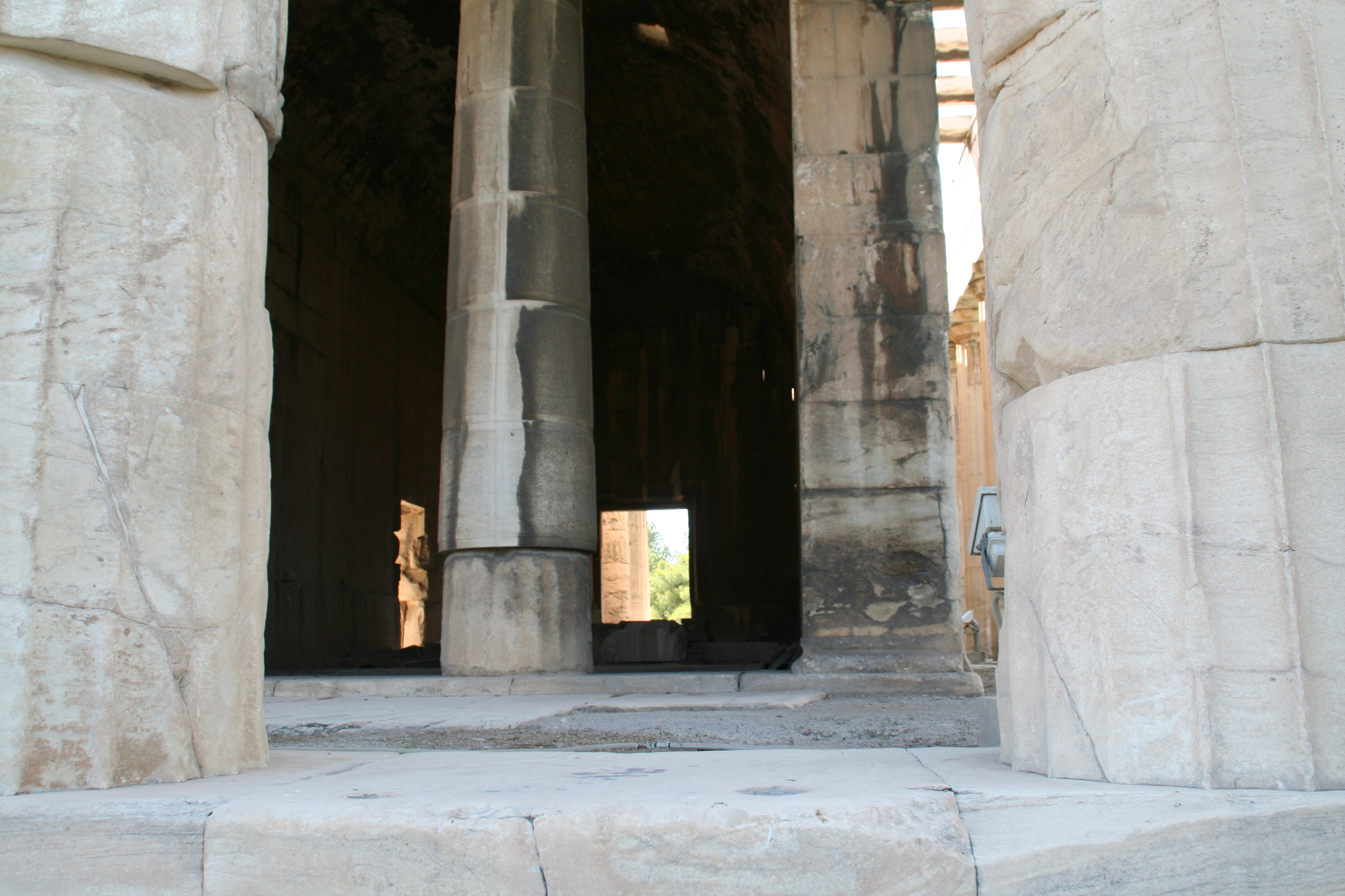 The metopes are blank panels in between the triglyphs. Very often, Doric metopes were carved with reliefs of scenes from Greek mythology, and the Temple of Hephaestus is no exception. The friezes of this temple depict scenes of the twelve labors of Hercules, the battle and fall of Troy, and an unidentified battle scene. It’s possible that the metopes that were not carved were, at one point in time, painted. We do know that some art has been lost from this site; records indicate that bronze statues of Hephaestus and Athena Ergani once stood inside as well.