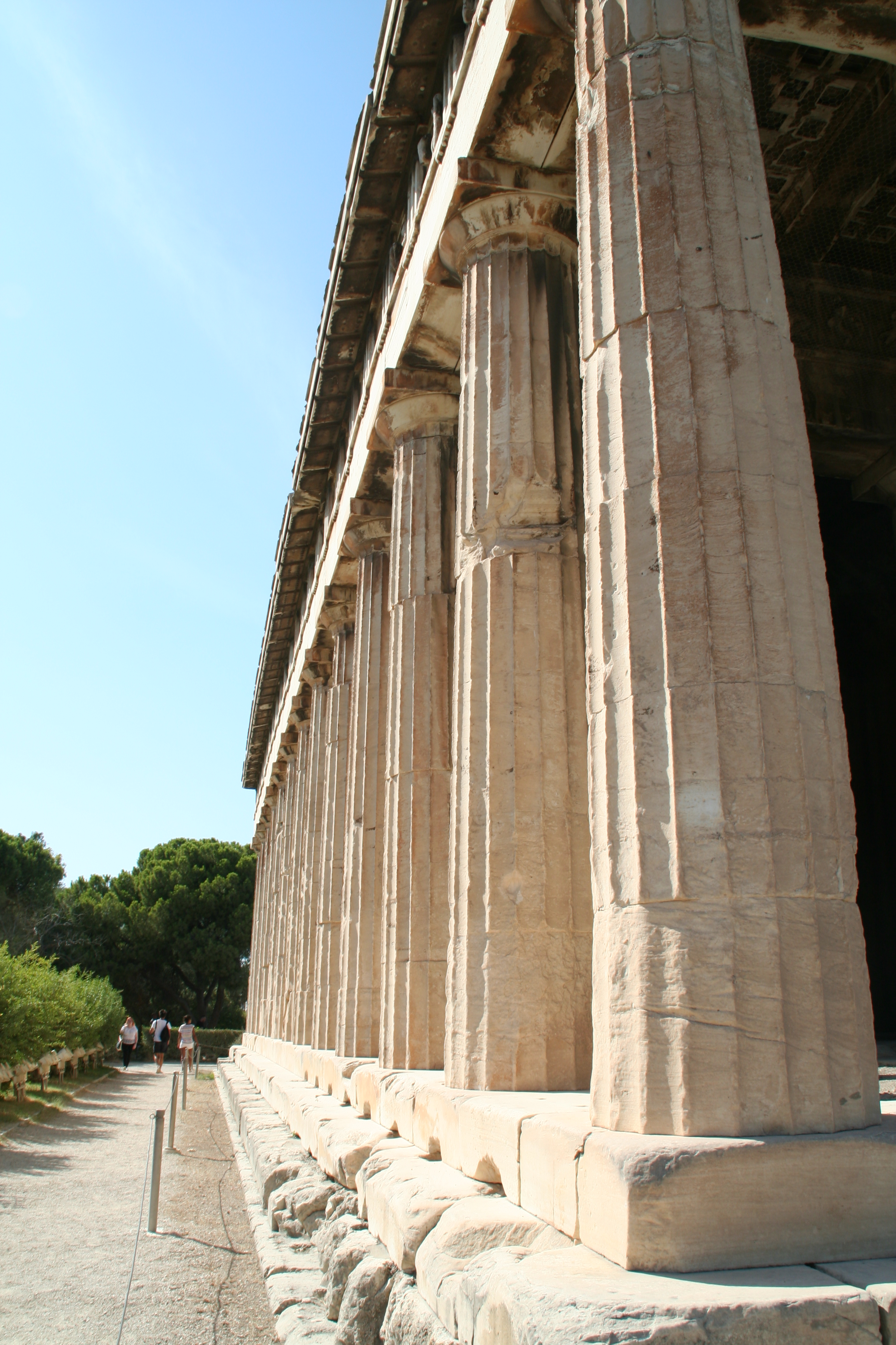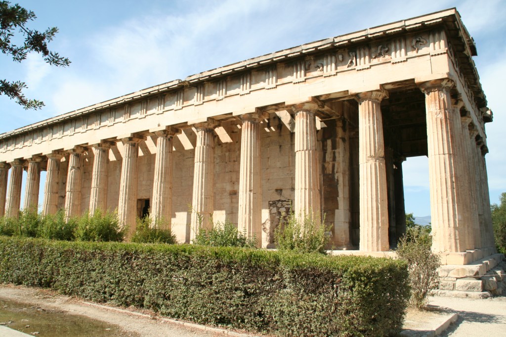 It was the Temple of Hephaestus that we were seeing. The Doric order temple was dedicated to Hephaestus (naturally), who was the son of Zeus and Hera, and a god of blacksmiths, metallurgy, and craftsmen. This temple has been incredibly well preserved so one can easily see the Doric trademarks. The columns are fluted, or grooved. Above the columns is a thick, horizontal element called the frieze. Doric friezes are decorated with alternating patterns of triglyphs and metopes.