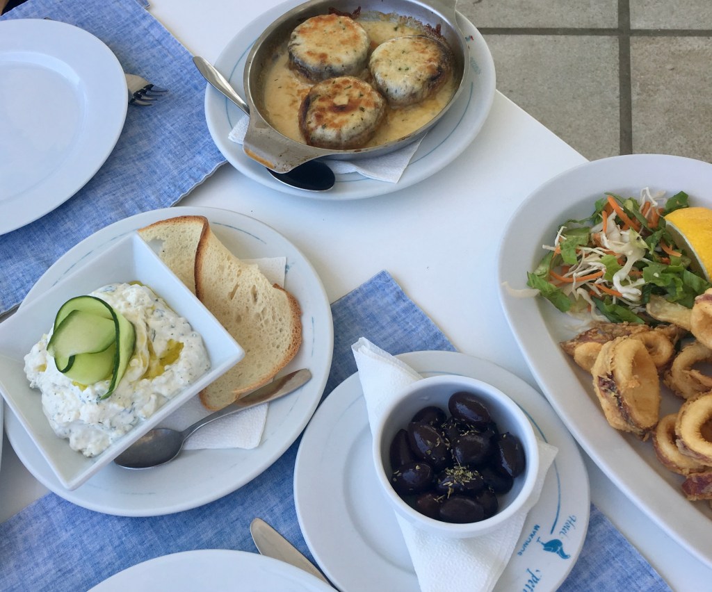 But finally we were shown are room. Cute, a little small but not too bad, it had a small balcony over looking the street. The hotel does offer rooms with a private small pool but we were good without one. We freshened up a bit and then needed some grub. That sea air was making us hungry. We wandered past some places – a small shop with a little bit of everything (we actually bought snorkels and face masks there later), some restaurants, some bars pumping out hip retro beats – and then we decided on Thea Restaurant. I’m not sure if you read my Athens blog post (see link in the first paragraph!) but our Greek eating theme was tzatziki. And this place did not disappoint. The stuffed mushrooms and calamari was so very excellent.
