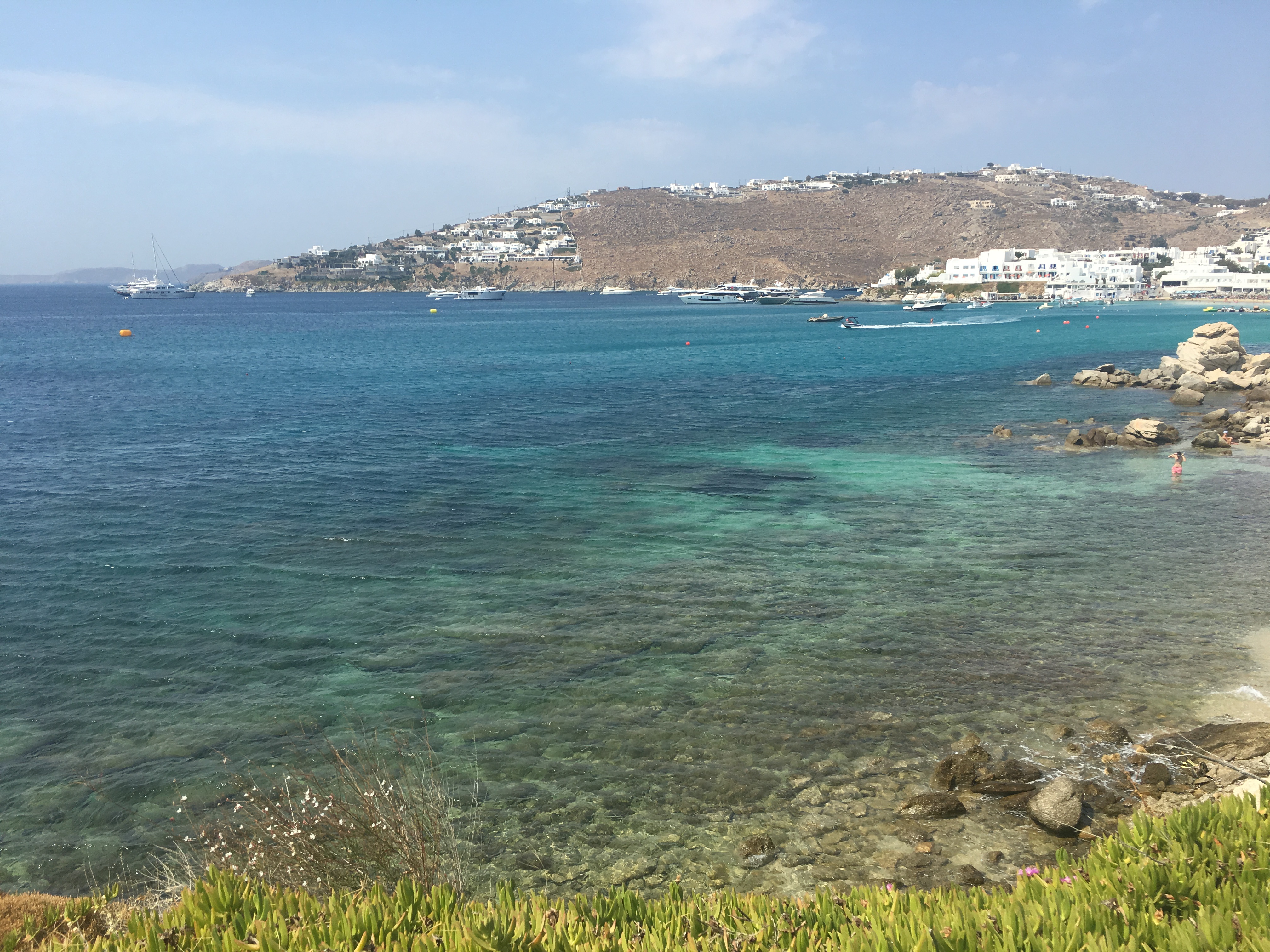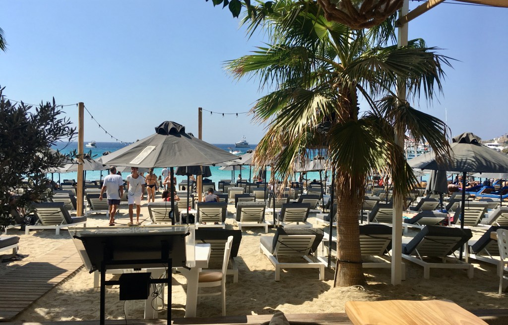 Mykonos is VERY wiiiiiiiiiiiinnnndddyyyyyy. I didn’t know! Getting off the ferry we were almost swept away. I thought it was just the day but our driver said it was always quite windy in Mykonos. And speaking of having a driver – all of the hotels I booked in Greece offered a service to pick us up whether it was the airport or the port. But our Mykonos hotel is the only one that offered this service for free – including taking us back to the port on our departure day. That, for me, is great service. The hotel was lovely – The Mykonos Dove hotel. It’s directly on beach Platis Gialos and beach chairs are included (not the first three front rows), breakfast buffet is included and very yummy and lots of restaurants are close by.